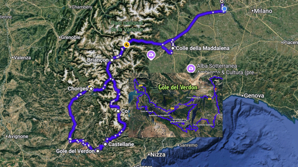 Parti da Novara e attraversa alcuni dei luoghi più spettacolari delle Alpi e della Provenza: Colle della Maddalena, Briançon, Colle della Cayolle, Castellane, le magnifiche Gole del Verdon, Chorges e il Colle di Vars.